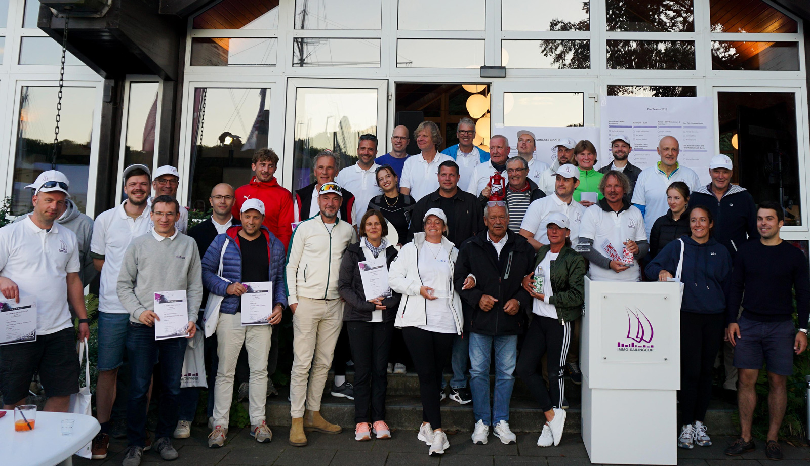 19.Sep 2025Sonne, Wind und Regen – der 11. IMMO-SAILINGCUP der WOHNKOMPANIE Berlin hatte alles zu bieten. Aber die Seglerinnen und Segler wie auch die Gäste auf der SY Prosit IV und dem Hausboot blieben auf Kurs und kämpften gemeinsam in einem der schönsten Wasserreviere Berlins auf der Unterhavel um Titel und Pokal. Die Plätze 1 bis 3 belegten die siegreichen Teams von Eichner Bastian Architekten, Zech Bau Berlin und BWP Berlin Architekten & Ingenieure. Nach der Regatta wurde am Nachmittag an Land weitergefeiert mit Spiele-Parcours, Siegerehrung und Abendbüfett. Großen Anklang fand die Spenden-Tombola zugunsten der Berliner Lebensretter von der DLRG. Hier kamen innerhalb einer Stunde über 1000 Euro zusammen. Zum Abschied wartete auf alle Besucher ein besonderes Präsent: „23kn“/23 Knoten – ein edler Gin, der von der Destillerie Alaska Spirits eigens für den diesjährigen IMMO-SAILINGCUP im GoWest Gewerbehöfequartier in Berlin-Schmargendorf destilliert wurde.