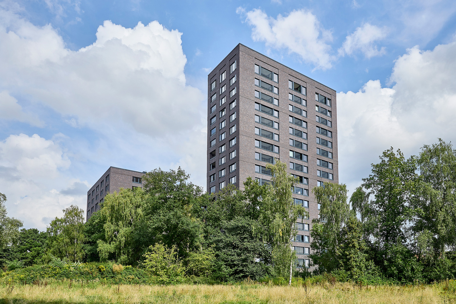 PERIGON – Hamburg-Winterhude: Das Perigon im Stadtteildreieck Winterhude, Barmbek und Alsterdorf ist der letzte Baustein des Hamburger Pergolenviertels. Das Gebäude hat im höchsten Gebäudeteil 18 Geschosse und eine maximale Höhe von 57 Metern. Auf dem 6.500 m² großen Grundstück sind 36.000 m² Bruttogeschossfläche für 345 Wohneinheiten, davon 166 geförderten Studierendenwohnungen und 20 Apartments für das Projekt „Hier wohnt Hamburgs Jugend“, das familienlose Jugendliche unterstützt, eine Kita, Lebensmitteleinzelhandel sowie Praxis- und Gewerbeflächen entstanden.